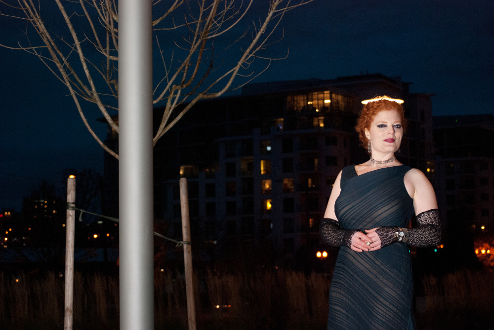 Decadent Decay photo session image number 7. This is the seventh part of a 7 part series of images created at Tanner Springs Park and The Fields Park in Portland, Oregon, and featuring Jenny Watson. The historic Centennial Mills provided a truly decadent background for these images.