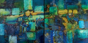 Jan Shield – “Onlooker,” Wood & bronze sculpture, 6′Gary Anderson – “Ladder Series 8 (dyptych) Acrylic, 4′ x 6′Tangie Pape Belmore, “Blue Thicket,” Mixed Media 4′ x 3′Peggy Clark – “NIght Lights,” Watercoler, 17″ x 11″Eileen Kressel – “At Home With You,” Monotype Print (1-9) 3′ x 2′Dyanne Locati – “Moonlight Serenade” (dyptych), Mixed Media,Bill Marlieb – “Gated Estate,” Acrylic on canvas, 30″ x 30″Thomas Rude – “Mallard” Wood Sculpture, 12″ tallMarla Schroeder – “Wild Spirit,” Acrylic, 4′ x 3′